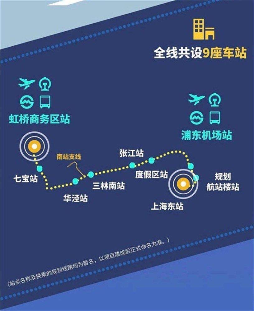 按照設(shè)計,機(jī)場聯(lián)絡(luò)線從虹橋樞紐站出發(fā)經(jīng)過滬杭鐵路外環(huán)線、七寶、華涇、三林、張江、迪士尼、浦東國際機(jī)場等重要地區(qū),最后達(dá)到上海東站,沿線設(shè)站9座。
