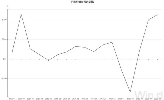 與此同時,與固定資產(chǎn)投資緊密相關(guān)的一個指標(biāo),延續(xù)了大幅增長。根據(jù)中國工程機械工業(yè)協(xié)會統(tǒng)計數(shù)據(jù),2020年5月份,各企業(yè)共計銷售各類挖掘機械產(chǎn)品31744臺,同比增長68%,這也延續(xù)了4月銷量同比增長近60%的趨勢。