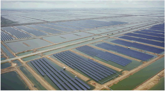 總投資15.24億元、占地7800余畝的濱州市沾化區(qū)濱海鎮(zhèn)通匯“漁光一體”現(xiàn)代產(chǎn)業(yè)園,采用漁光一體模式進行綜合開發(fā),將光伏電站與養(yǎng)殖業(yè)相結合,在蝦池上建設光伏電站,形成“上可發(fā)電,下可養(yǎng)殖”的發(fā)電模式,將現(xiàn)代智慧農(nóng)業(yè)、光伏產(chǎn)業(yè)進行科學、有機的結合,并適度疊加休閑觀光農(nóng)業(yè),打造集新漁業(yè)、新能源、新農(nóng)村為一體的“三新”現(xiàn)代產(chǎn)業(yè)園,把不毛之地變成寸金寸土的寶地,實現(xiàn)了向鹽堿地要效益。該產(chǎn)業(yè)園是目前全國最大的單體“漁光一體”項目。 來源: 大眾日報