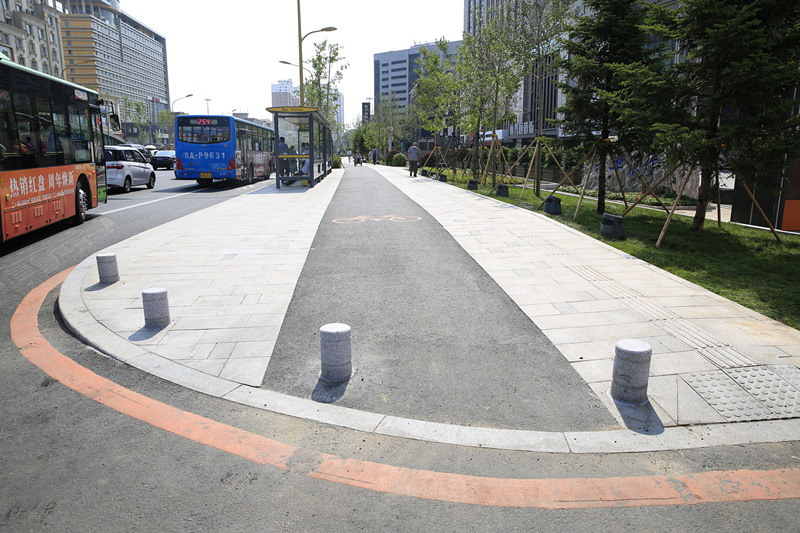 整個提升改造全程設(shè)置了自行車道、人行步道,讓慢行系統(tǒng)更加疏朗、通透。全線設(shè)置盲道,在公交站點處新增盲道,確保盲人出行安全。按照規(guī)劃紅線,取締一批占用慢行系統(tǒng)的停車位,最大限度保證慢行系統(tǒng)的連續(xù)性。并且將自行車道抬高與人行步道平齊,雨天路面可以直接向兩側(cè)樹池和綠化帶自然排水,更具海綿城市建設(shè)理念。