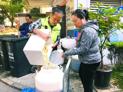 很多居民知道這件好事后,還主動把濕垃圾分成兩袋,一袋專門裝果皮、果核和爛果,另一袋裝其他濕垃圾,交到垃圾箱房。“就連周邊水果店老板都聞風而來,大家太踴躍,酵素原料太多,快要來不及做了。”管理員笑著訴說“甜蜜的煩惱”。
