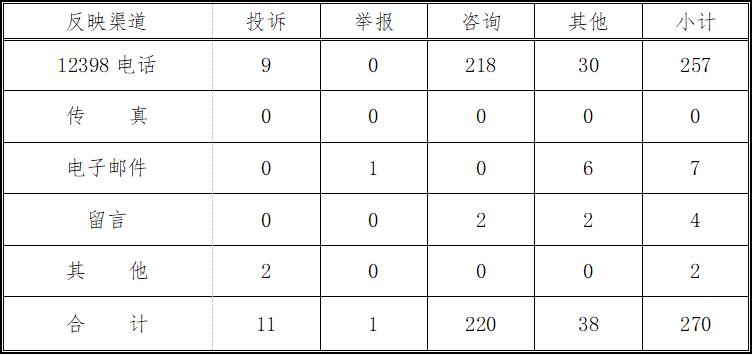 按反映渠道分類,12398電話257件,電子郵件7件,留言4件,其他2件。(2020年6月收到有效信息情況見表一)
