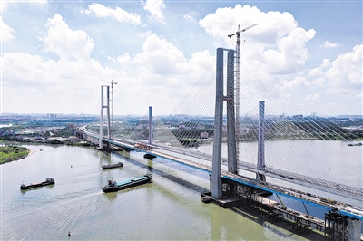 移動(dòng)版:廣州南沙港鐵路跨西江特大斜拉橋完成最后一塊鋼箱梁吊裝