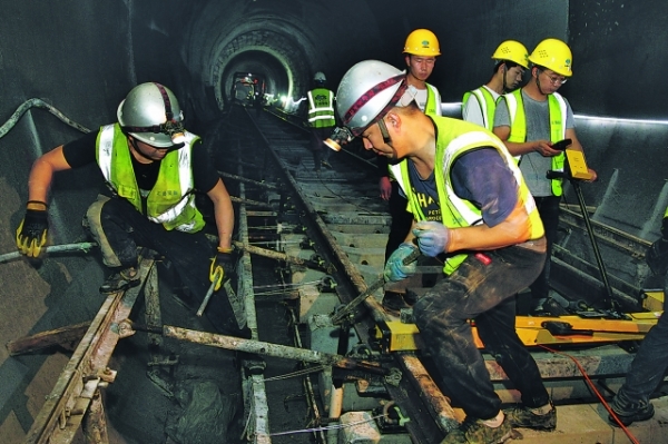 圖為工人在富源北路站——森林公園站區(qū)間內(nèi),為軌道混凝土澆筑作模板支護準備。記者 周永 攝