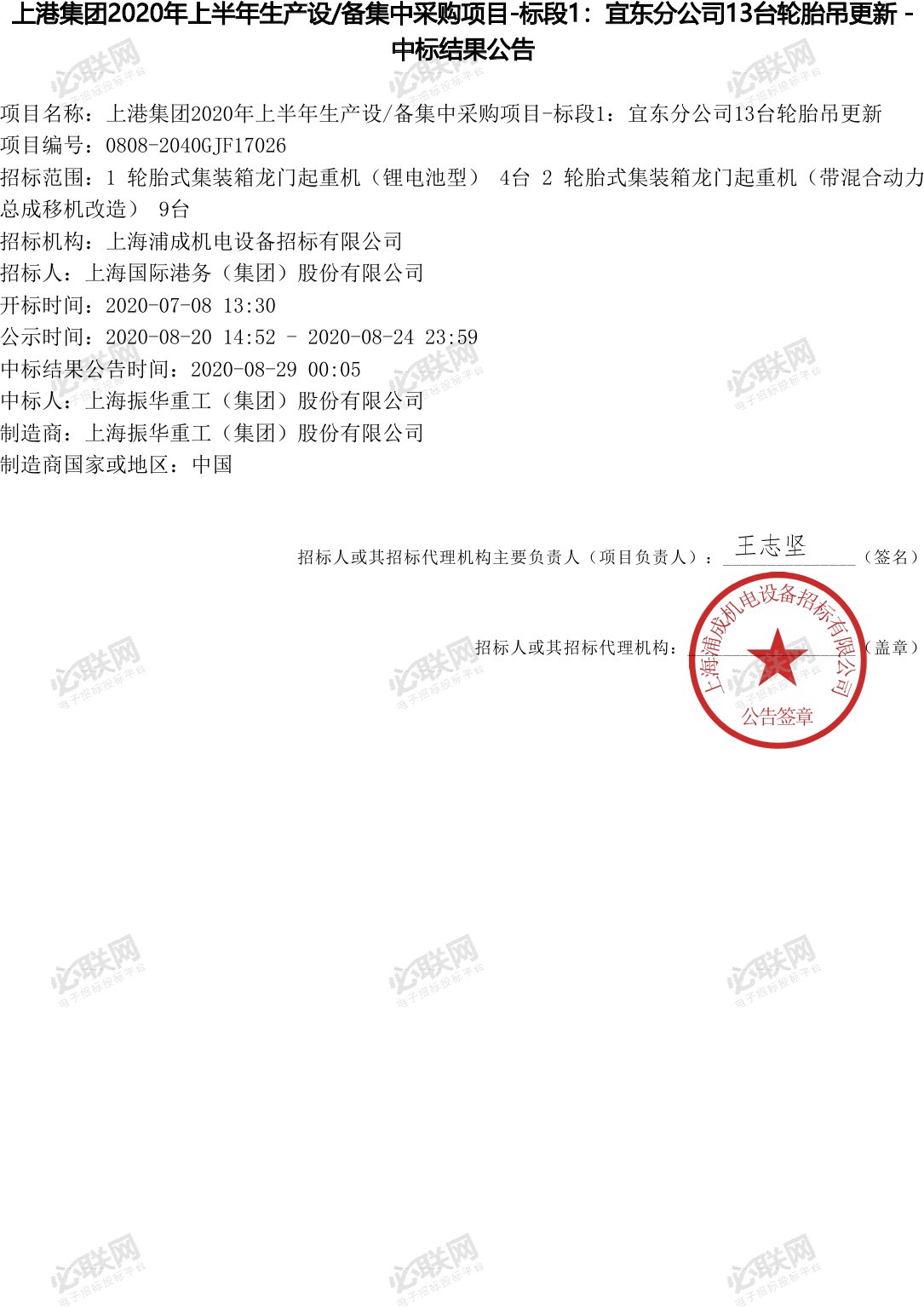 移動版:上港集團2020年上半年生產設/備集中采購項目-標段1:宜東分公司13臺輪胎吊更新中標結果公告(1)