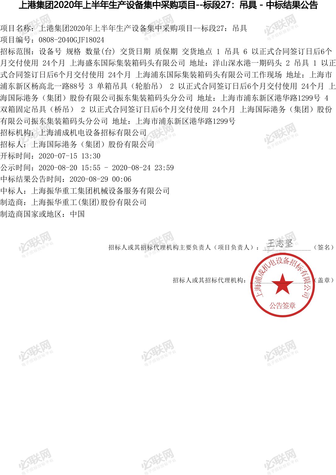 上港集團(tuán)2020年上半年生產(chǎn)設(shè)備集中采購項(xiàng)目--標(biāo)段27:吊具中標(biāo)結(jié)果公告(1)