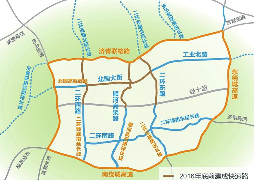 1997年,濟(jì)南第一條城市高架——順河快速路開建。截至2016年底,濟(jì)南共建成順河、北園、二環(huán)東、二環(huán)西、二環(huán)南等共計(jì)53公里的城市快速路。