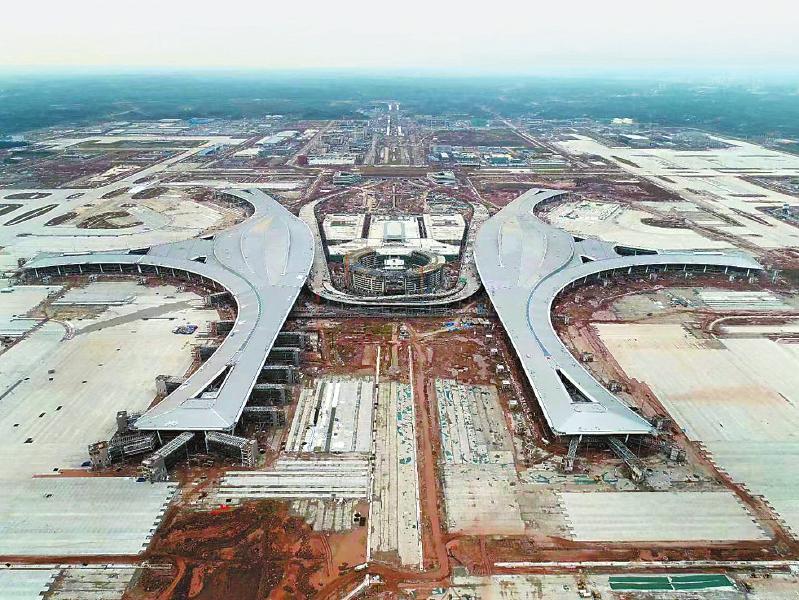 成都天府國際機場航站區(qū)航站樓前高架橋施工現(xiàn)場。中建八局供圖