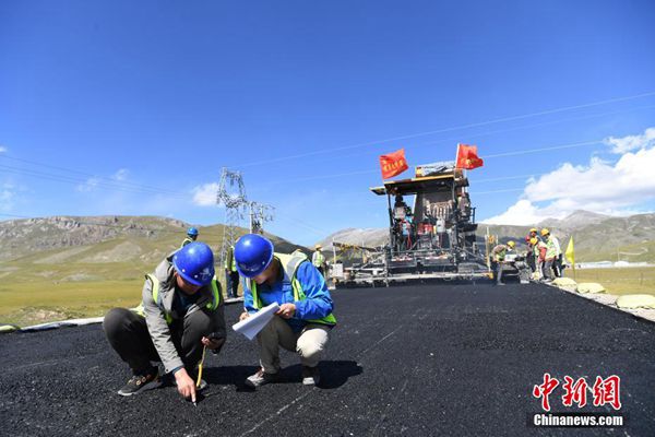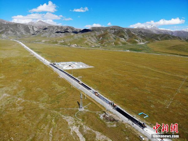 9月2日,由中鐵四局承建施工的肅(甘肅肅南)祁(青海祁連)G213線公路瀝青正式攤鋪,標(biāo)志著“一帶一路”沿線甘肅至青海“咽喉”要道最高海拔標(biāo)段正式進(jìn)入路面施工階段,為如期通車奠定基礎(chǔ)。中鐵四局承建了肅祁公路5標(biāo)段全長(zhǎng)3639米的施工任務(wù),該標(biāo)段平均海拔約4200米,是目前國(guó)內(nèi)在建的海拔最高的公路之一,也是肅祁公路海拔最高的標(biāo)段。圖為9月1日,航拍甘肅與青海交界的肅祁公路實(shí)驗(yàn)路段鋪路現(xiàn)場(chǎng)。