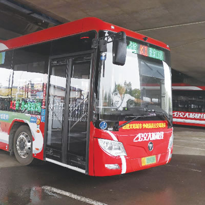 清晨即將出發(fā)的張家口K1路氫燃料電池公交車(chē)。