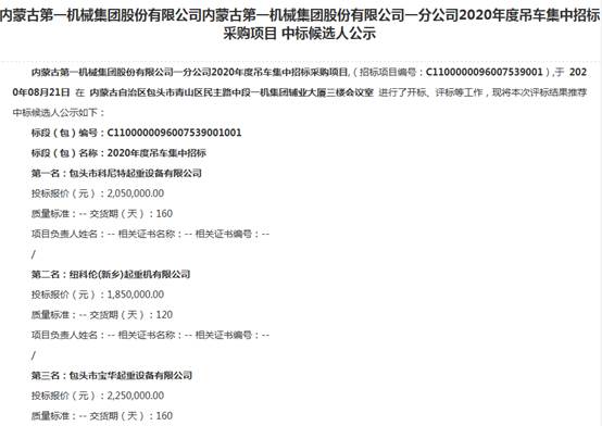 移動版:內(nèi)蒙古第一機(jī)械集團(tuán)股份有限公司一分公司2020年度吊車集中招標(biāo)采購項目結(jié)果公示