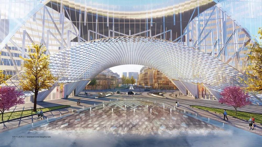 杭州世紀中心(杭州之門)鋼拱連橋主體結構完工,“鋼拱連橋”位于“杭州之門”的雙塔之間,是連通雙塔的空中連廊,同時也是中間連接構造的支撐部分。
