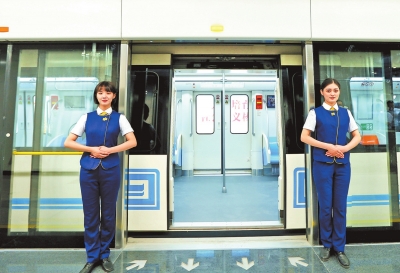 9月9日,地鐵工作人員笑迎試乘人員。本報(bào)記者鄧放攝
