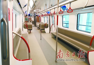 此次交付的列車外形采用富有張力的“飛翼”造型,與普通的地鐵列車差別較大,整體外形與高鐵動車相仿。列車車廂里既包含廣州地鐵特征的元素,又融入了高鐵動車組的特點。中車株機副總工程師柳曉峰介紹,列車在設(shè)計過程中充分考慮了市域快線特點,中間車設(shè)置4對大開度雙開塞拉門,實現(xiàn)乘客快速乘降。采取有別于普通地鐵的橫縱結(jié)合座椅布局(見下圖,符超軍攝),載客量比高鐵動車組多20%。