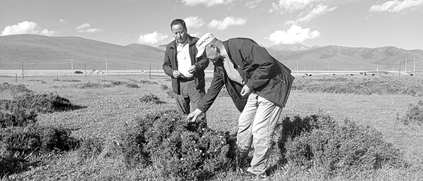 峨堡鎮(zhèn)黨委書記如意和茶廠廠長火博程實地查看野生金露梅生長情況。 通訊員 王軍 攝
