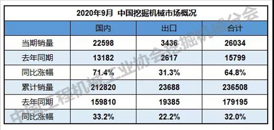 2020年9月,共計銷售各類挖掘機(jī)械產(chǎn)品26034臺,同比漲幅64.8%。國內(nèi)市場銷量22598臺,同比漲幅71.4%。出口銷量3436臺,同比漲幅31.3%。