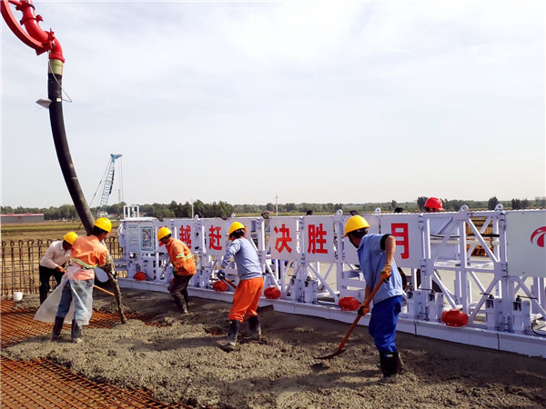 日前,在泵車、混凝土罐車、攤鋪機(jī)的轟鳴聲中,京德高速公路ZT5標(biāo)K53+993清北2號大橋左幅第五聯(lián)橋面上完成了首件橋面鋪裝混凝土澆筑作業(yè),全線橋面鋪裝施工正式拉開帷幕。