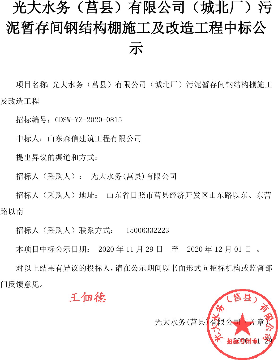 移動(dòng)版:光大水務(wù)(莒縣)有限公司(城北廠)污泥暫存間鋼結(jié)構(gòu)棚施工及改造工程中標(biāo)結(jié)果公示