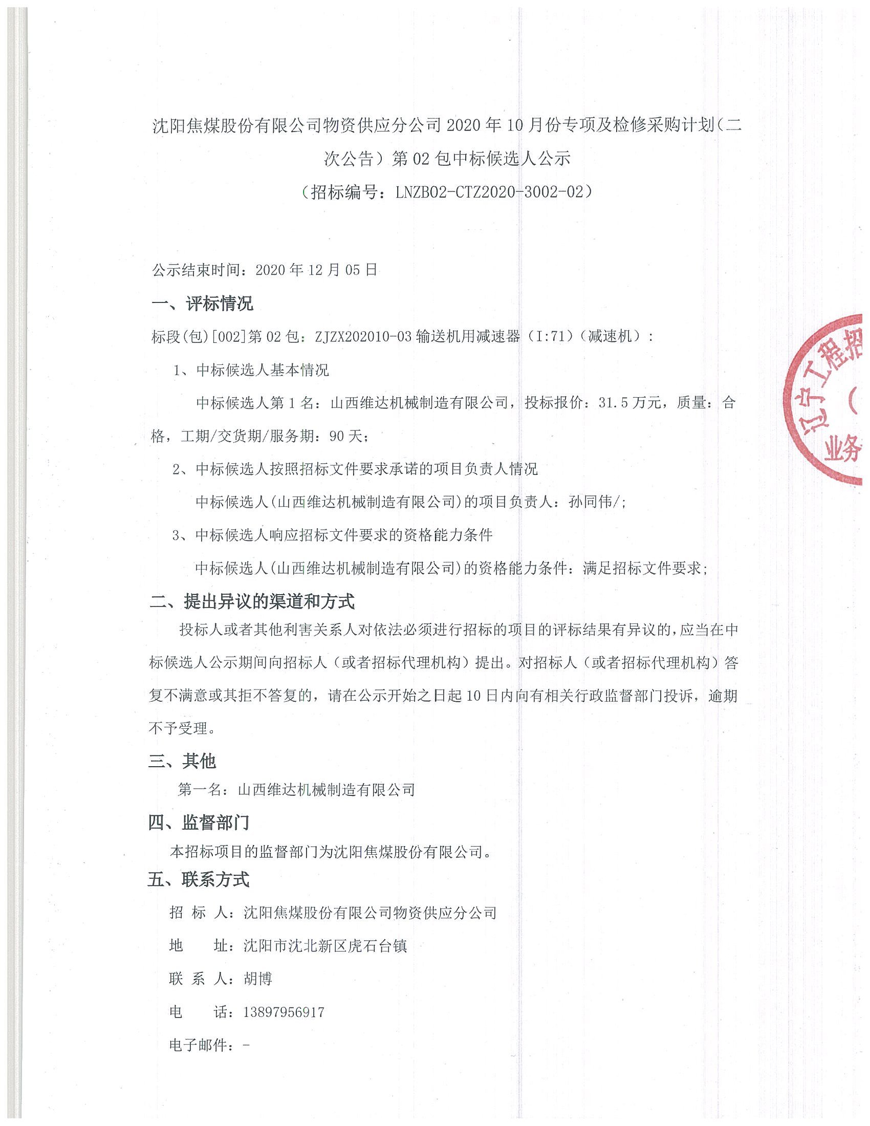 沈陽焦煤股份有限公司物資供應(yīng)分公司2020年10月份專項(xiàng)及檢修采購計(jì)劃(二次公告)第02包中標(biāo)候選人公示