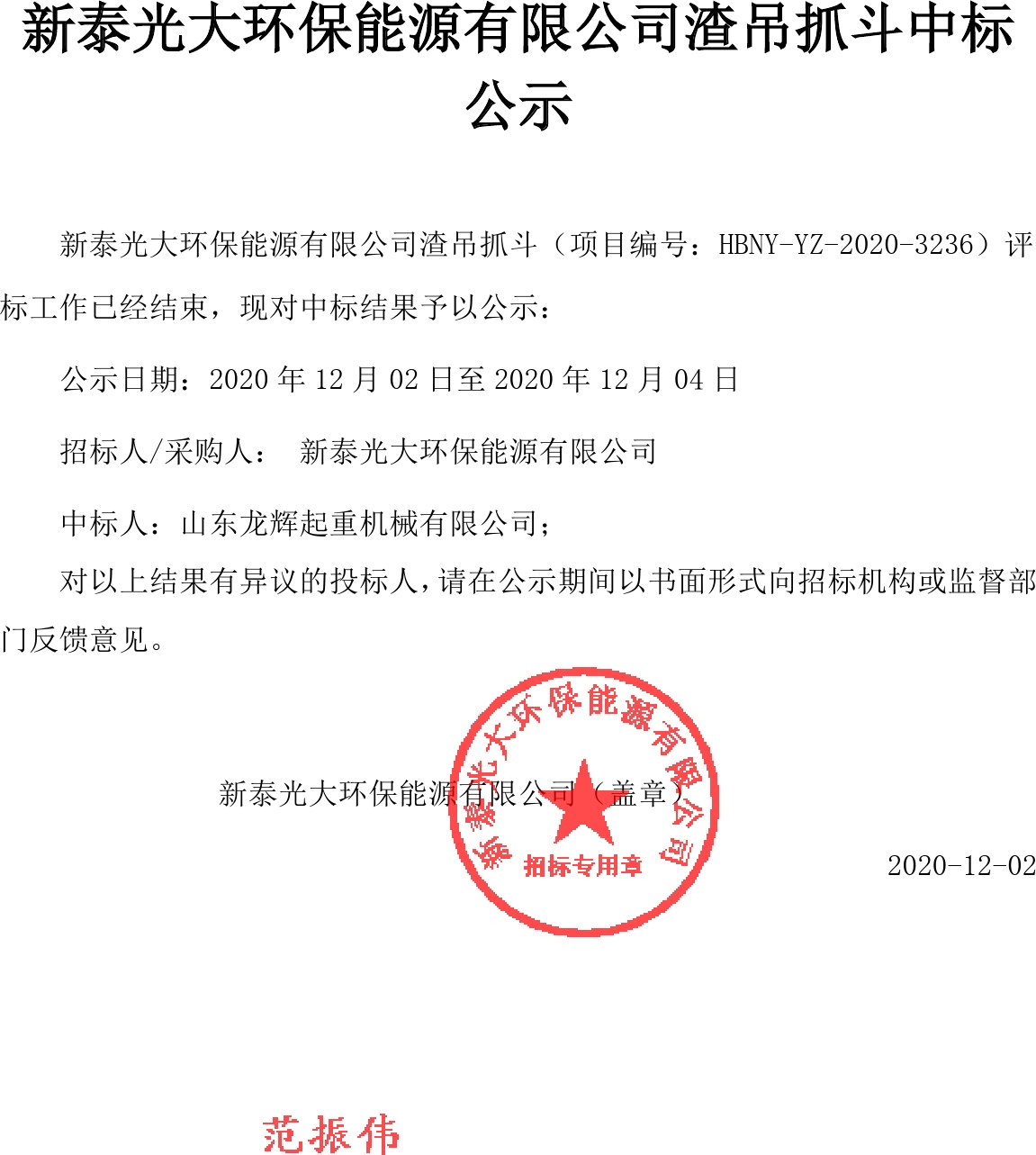 移動(dòng)版:新泰光大環(huán)保能源有限公司渣吊抓斗中標(biāo)結(jié)果公示