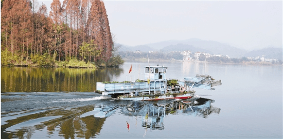 日前,建德市三江打撈隊(duì)對(duì)新安江下涯鎮(zhèn)馬目段水面漂浮的水葫蘆進(jìn)行打撈,確保水質(zhì)清潔衛(wèi)生。  拍友 寧文武 攝