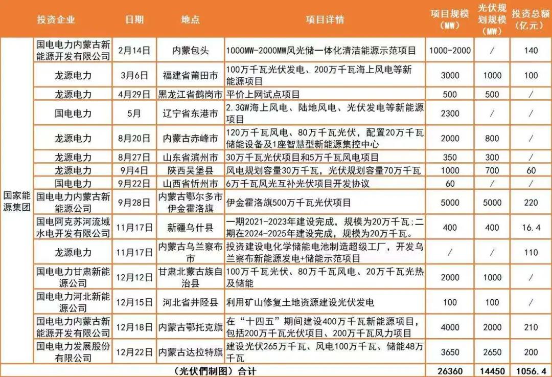 此外,2020年國(guó)家能源集團(tuán)共簽約15個(gè)新能源投資建設(shè)項(xiàng)目,投資總額超千億元,總規(guī)模超過(guò)26GW,其中光伏近15GW,占比過(guò)半。項(xiàng)目遍及內(nèi)蒙古、福建、黑龍江、遼寧、新疆、甘肅、山東、山西、河北、陜西等10個(gè)省/自治區(qū)。