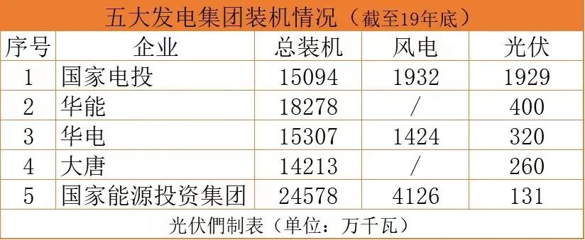 與其他發(fā)電集團(tuán)不同的是,在可再生能源領(lǐng)域的布局中,國(guó)家能源集團(tuán)還是全球最大的風(fēng)電投資商,并且一度暫停光伏投資數(shù)年。截至2019年底,該集團(tuán)持有超過(guò)40GW的風(fēng)電裝機(jī),與之形成鮮明對(duì)比的是,光伏伏裝機(jī)卻位居五大發(fā)電集團(tuán)最后一位,僅為1.31GW。盡管在今年的光伏項(xiàng)目資源競(jìng)爭(zhēng)中,也多次出現(xiàn)了國(guó)家能源集團(tuán)的身影,但從公開的項(xiàng)目信息來(lái)看,與大唐、華能等同樣光伏體量較小的發(fā)電集團(tuán)相比,國(guó)家能源集團(tuán)在光伏方面的投資力度仍略遜一籌。