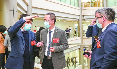 昨天,王如路委員(左一)在分組會議間隙,向多位委員介紹,隨著15號線的投入運營,上海軌道交通總運營公里數(shù)達(dá)到772公里,成為世界上運營里程最長的軌道交通城市。記者 張海峰 攝