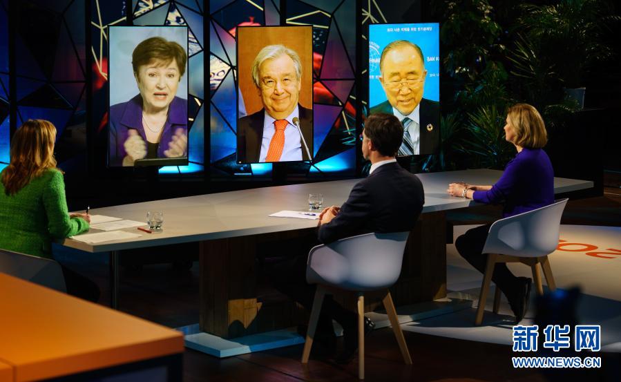 這是1月25日在荷蘭海牙拍攝的聯(lián)合國秘書長古特雷斯(中)等通過視頻連線出席首屆氣候適應峰會。