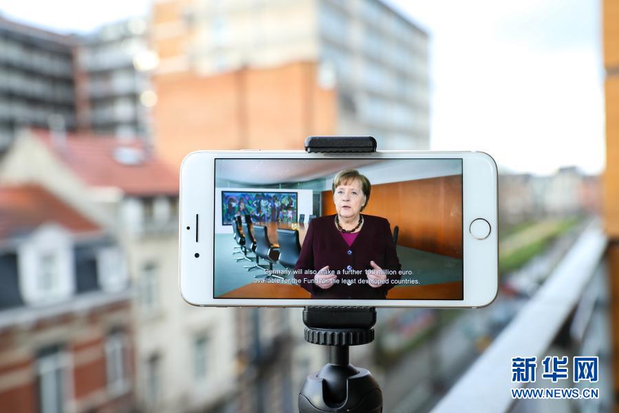 這是1月25日在比利時布魯塞爾拍攝的德國總理默克爾在首屆氣候適應峰會上發(fā)表視頻講話的屏幕畫面。
