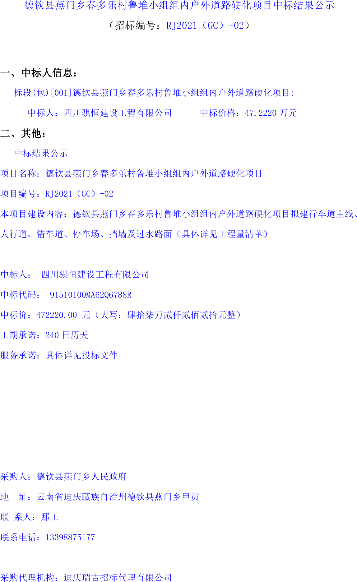 移動版:云南:德欽縣燕門鄉(xiāng)春多樂村魯堆小組組內(nèi)戶外道路硬化項目中標(biāo)結(jié)果公示