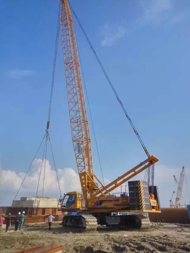 大橋崛起,重器為盾。跟隨項(xiàng)目組最先進(jìn)場(chǎng)的是6臺(tái)徐工履帶起重機(jī),克服孟加拉濕熱多雨的作業(yè)環(huán)境,即使身陷“泥塘”,也能輕松自如,一路前行如履平地,展現(xiàn)超強(qiáng)的“涉水”能力,高效地完成了混凝土梁、鋼筋籠等吊裝任務(wù)。