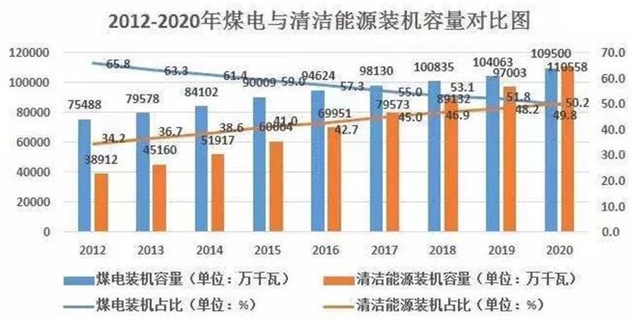 值得注意的是,在連續(xù)多年的清潔發(fā)電高速增長和煤電緩增長后,2020年底,中國煤電總裝機容量占比首次下降到50%以下。