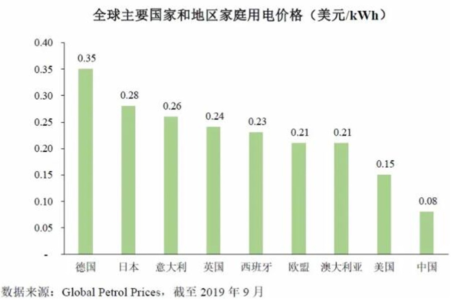 與中國相比,一些發(fā)達國家的居民用電成本高昂。根據Global Petrol Prices數據,德國、日本、英國、澳大利亞和美國的居民用電均價分別為0.38、0.29、0.26、0.25和0.15美元/kWh,而中國民用電價僅為0.08美元/kWh。