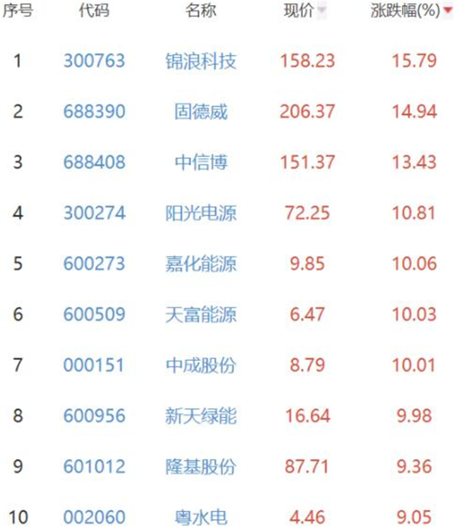 此次上漲的光伏股都是行業(yè)內(nèi)的細(xì)分產(chǎn)業(yè)領(lǐng)軍企業(yè),比如組件類包括:天合光能、晶澳科技、隆基股份、東方日升等。在多晶硅、硅片等上游,通威股份、中環(huán)股份、新特能源等也在大漲個(gè)股中。逆變器方向上,錦浪科技、上能電氣、陽光電源及固德威等全部暴漲。電池及輔材方向上,愛旭科技、福斯特、福萊特、海優(yōu)新材、中信博、亞瑪頓等都有所上揚(yáng)。龍頭股和成長股顯現(xiàn)了良好的漲幅走勢(shì)。