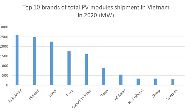 隨著越南光伏市場的蓬勃發(fā)展,數(shù)據(jù)顯示,2020年越南全年總裝機量為13.4GW,其中屋頂裝機量9.205GW來自屋頂項目,在FIT2政策的支持下,僅12月的單月的出貨量為2.3GW. 晶科全年出貨超過2.5GW,以超過18%的市占穩(wěn)居龍頭,其中地面電站市占超過36.8%。