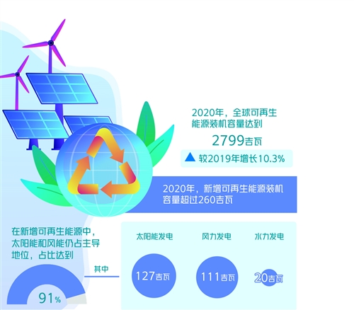 總部位于阿聯(lián)酋首都阿布扎比的國(guó)際可再生能源署(IRENA)近日發(fā)布報(bào)告《可再生能源裝機(jī)容量數(shù)據(jù)2021》。報(bào)告稱,2020年,全球可再生能源裝機(jī)容量達(dá)到2799吉瓦,較2019年增長(zhǎng)10.3%;新增可再生能源裝機(jī)容量超過(guò)260吉瓦。