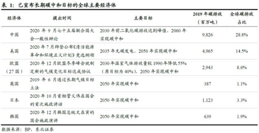 并且2020年下半年以來,全球主要經濟體陸續(xù)提出長期“碳中和”目標,當下減排已成全球共識。