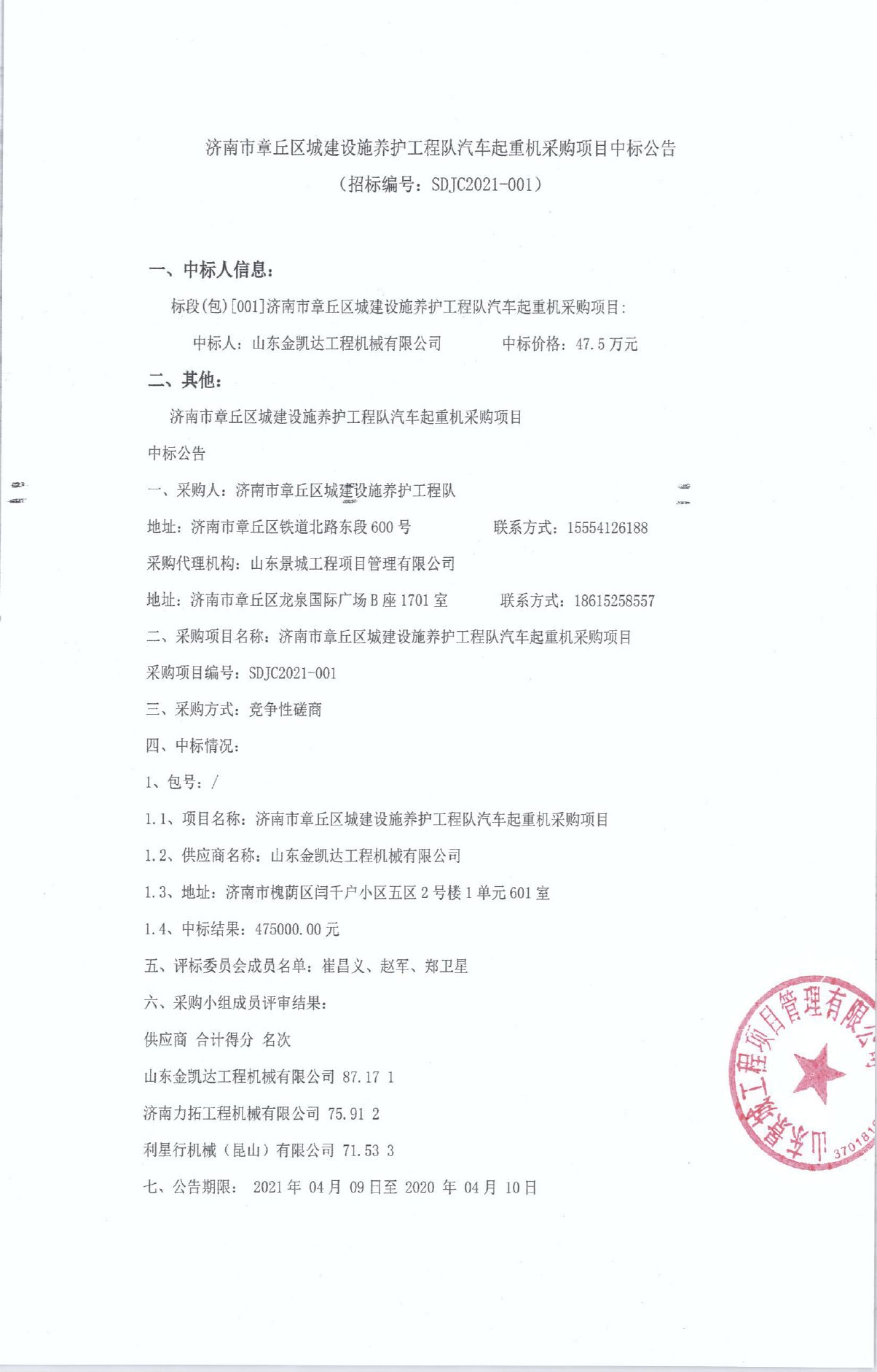 山東:濟(jì)南市章丘區(qū)城建設(shè)施養(yǎng)護(hù)工程隊(duì)汽車起重機(jī)采購項(xiàng)目中標(biāo)公告