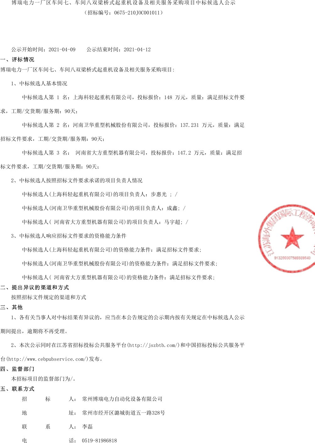 移動版:江蘇:博瑞電力一廠區(qū)車間七、車間八雙梁橋式起重機(jī)設(shè)備及相關(guān)服務(wù)采購項目中標(biāo)候選人公示