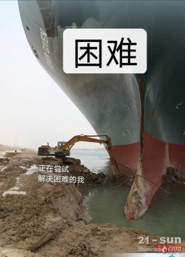 為了解救擱淺的“長賜號”,蘇伊士運河管理局派出一輛挖掘機(后又派出多輛挖掘機),疏通船身周圍的沙石。