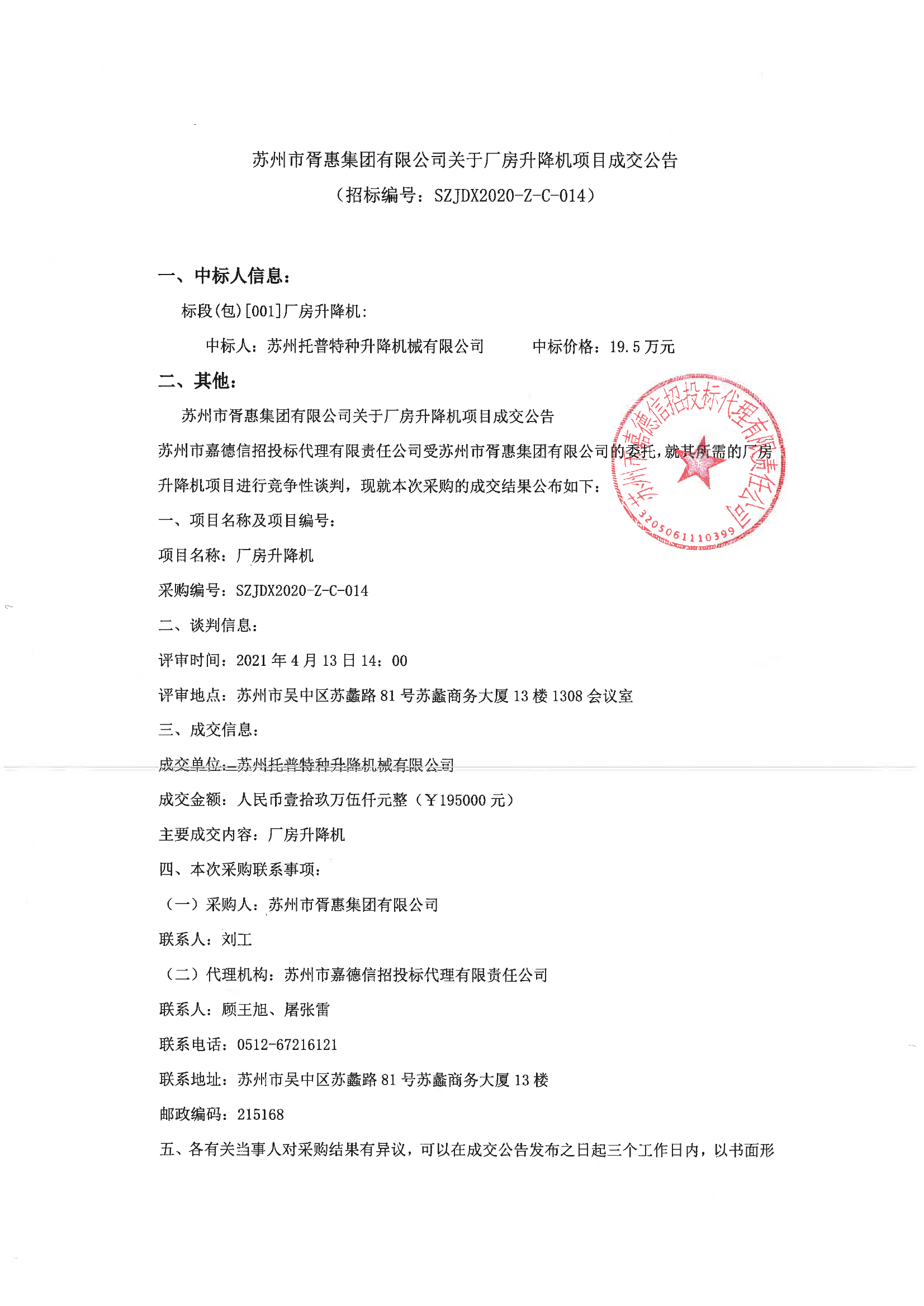 移動版:江蘇:蘇州市胥惠集團(tuán)有限公司關(guān)于廠房升降機(jī)項(xiàng)目成交公告
