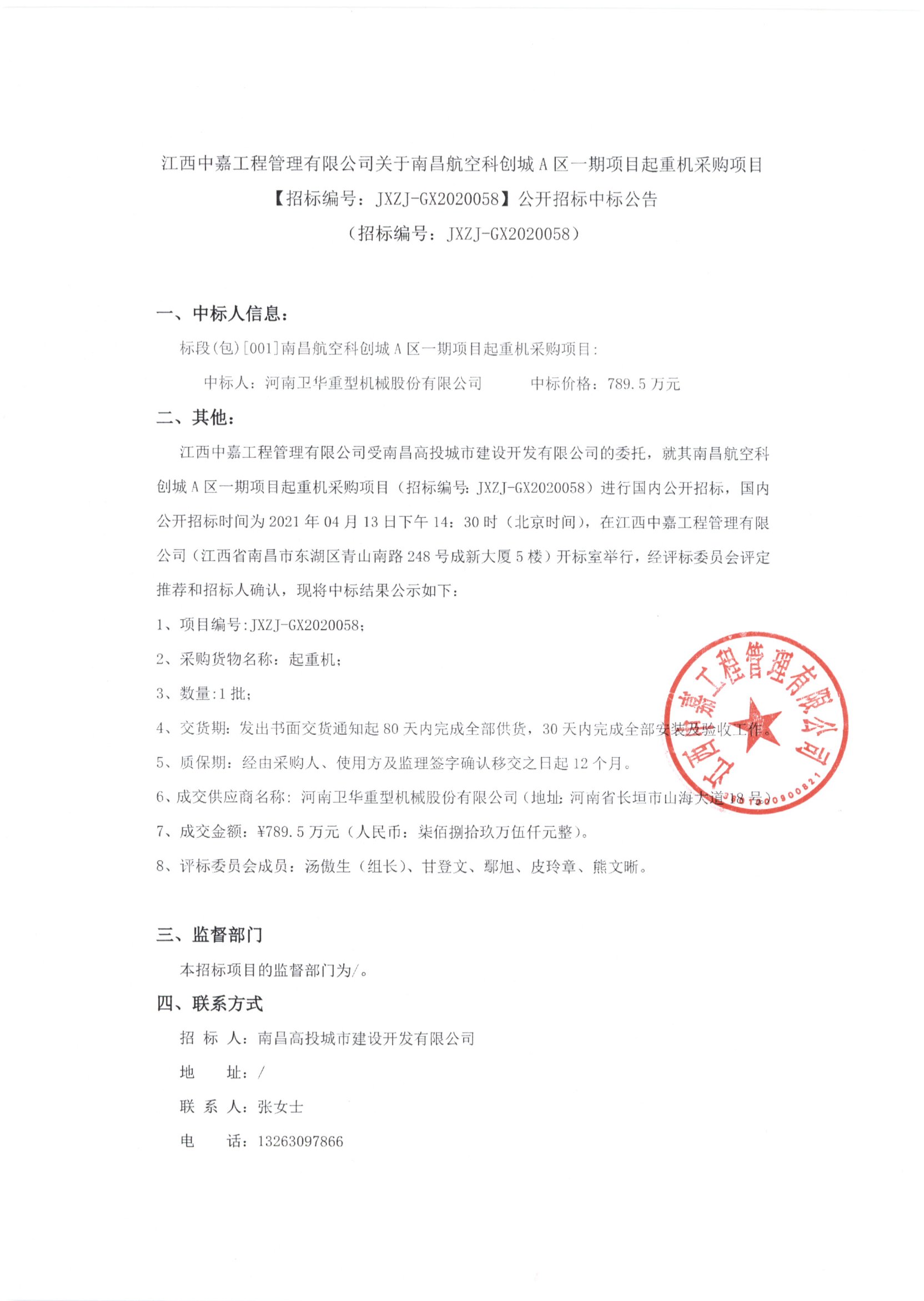 江西中嘉工程管理有限公司關(guān)于南昌航空科創(chuàng)城A區(qū)一期項(xiàng)目起重機(jī)采購(gòu)項(xiàng)目【招標(biāo)編號(hào):JXZJ-GX2020058】公開(kāi)招標(biāo)中標(biāo)公告
