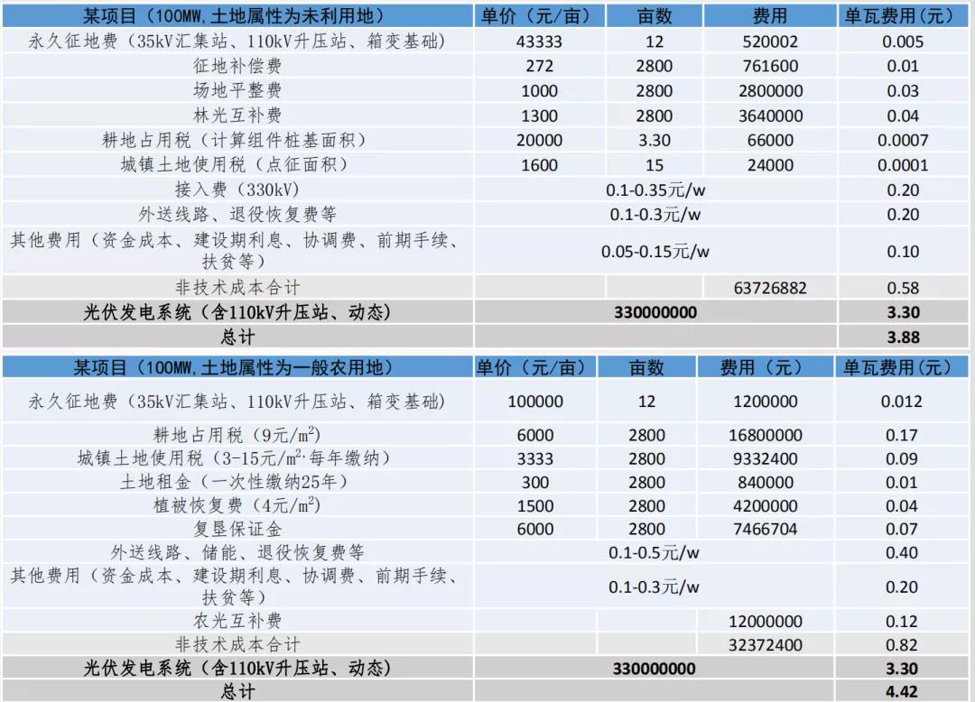 關(guān)于土地的成本,除了租金,還有耕地占用稅、城鎮(zhèn)土地使用稅以及青苗補(bǔ)償、場(chǎng)地平整、復(fù)墾費(fèi)等眾多細(xì)項(xiàng)。西勘院總圖所所長(zhǎng)惠星一份測(cè)算數(shù)據(jù)顯示,建設(shè)在未利用地、一般農(nóng)田的某100MW光伏電站項(xiàng)目,非技術(shù)成本占比達(dá)到了15%-19%。除了土地之外,電網(wǎng)接入也是非技術(shù)成本中占比最高的一個(gè)部分。