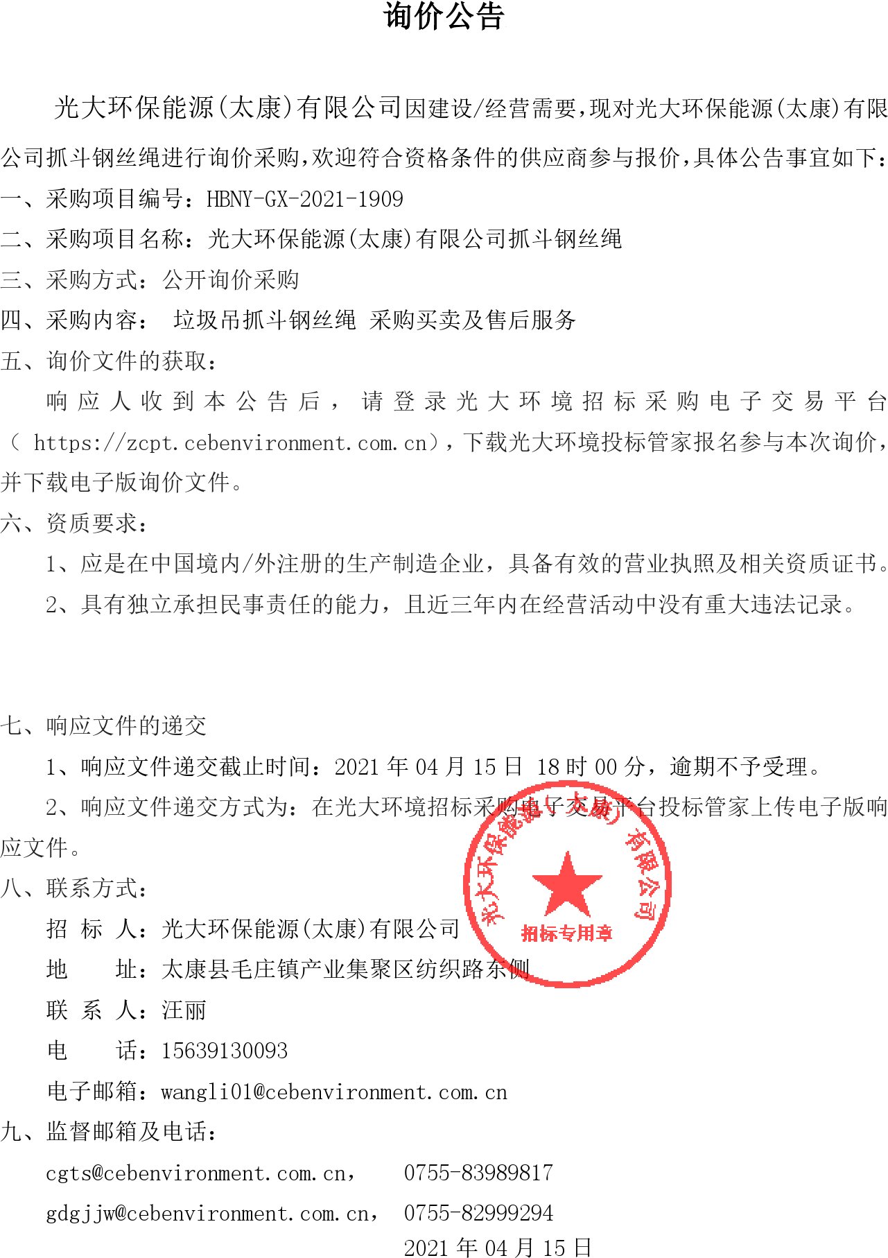 光大環(huán)保能源(太康)有限公司抓斗鋼絲繩詢價公告 SWF文件鏈接
