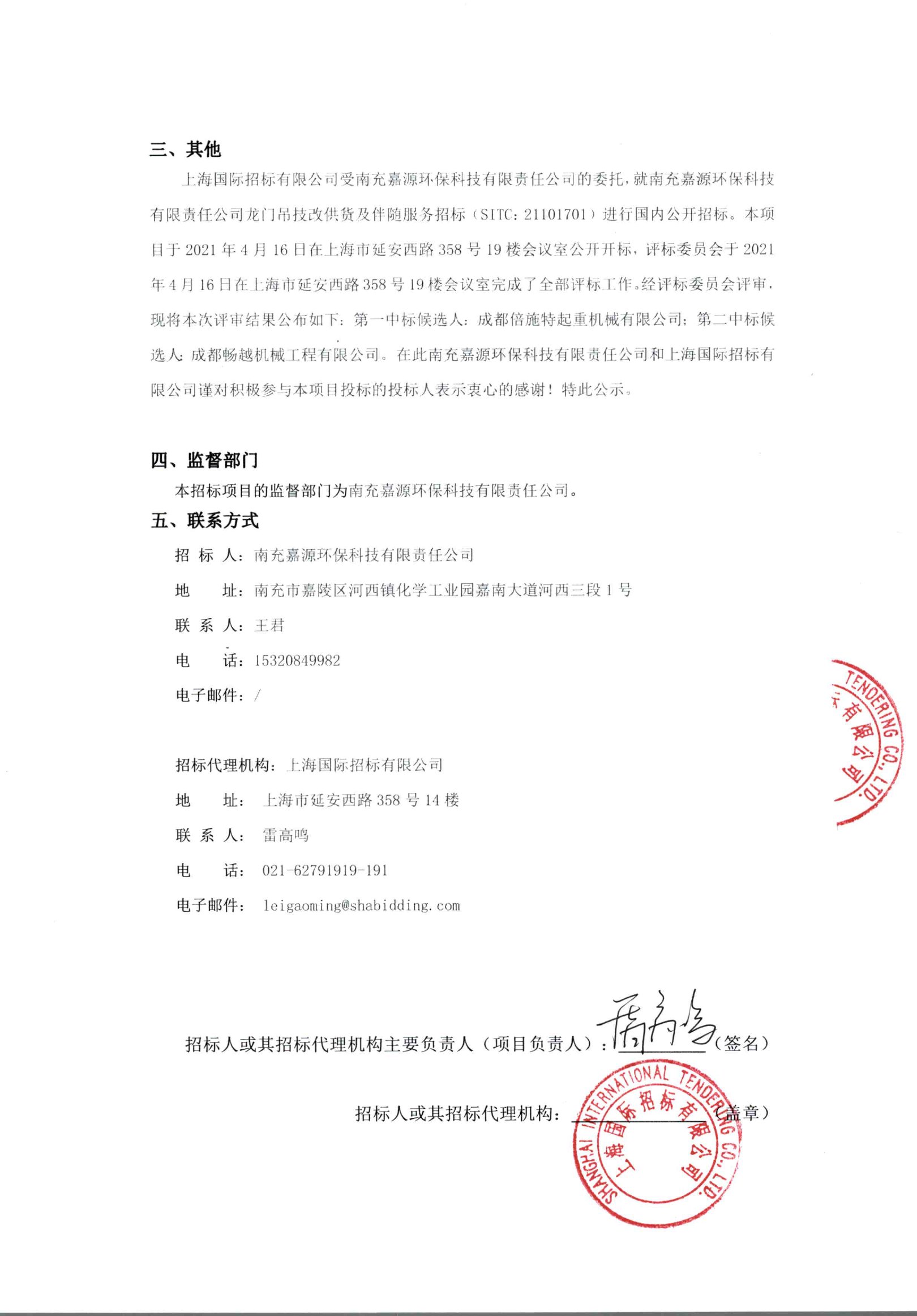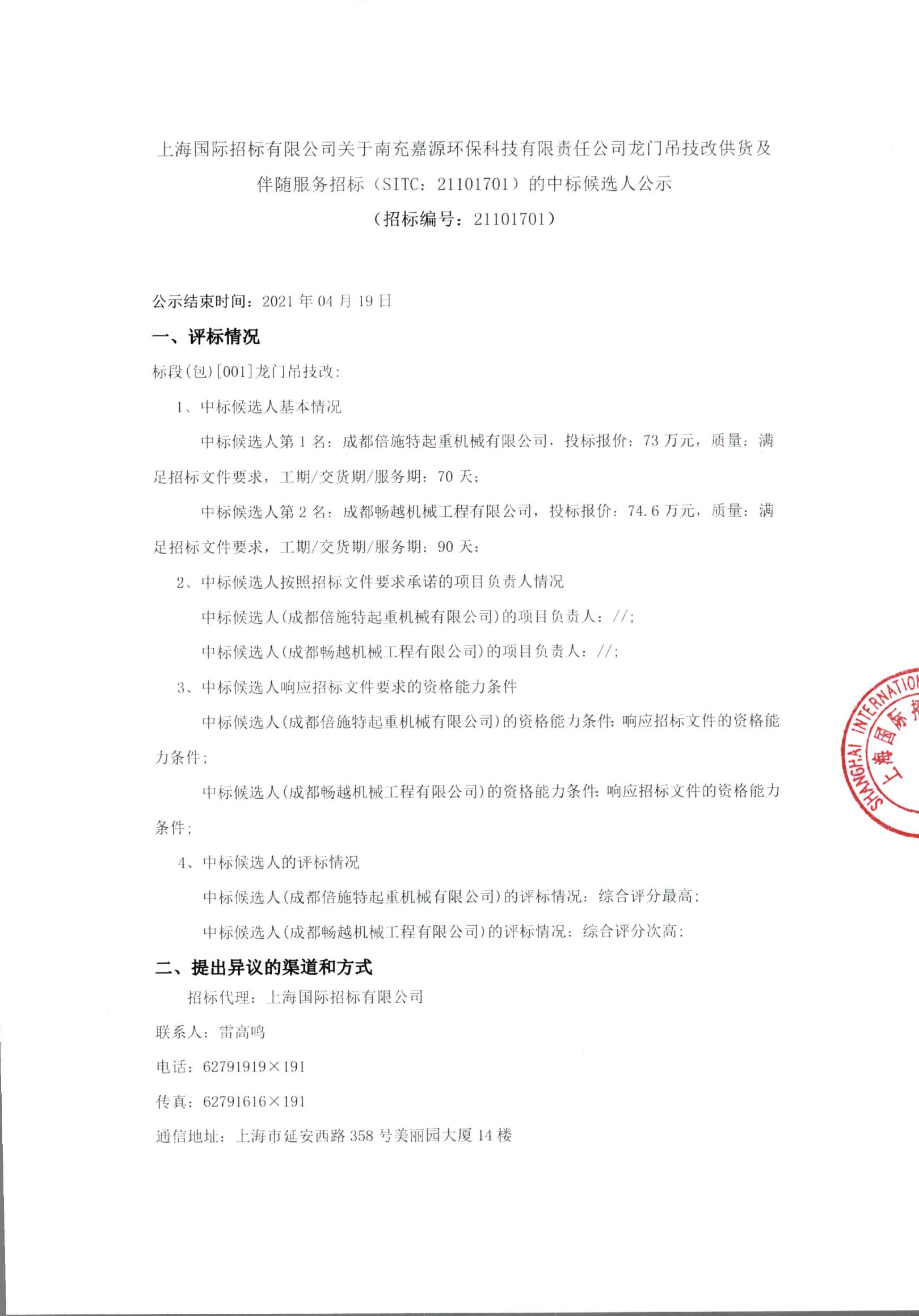 移動版:上海:關(guān)于南充嘉源環(huán)保科技有限責任公司龍門吊技改供貨及伴隨服務招標(SITC:21101701)的中標候選人公示