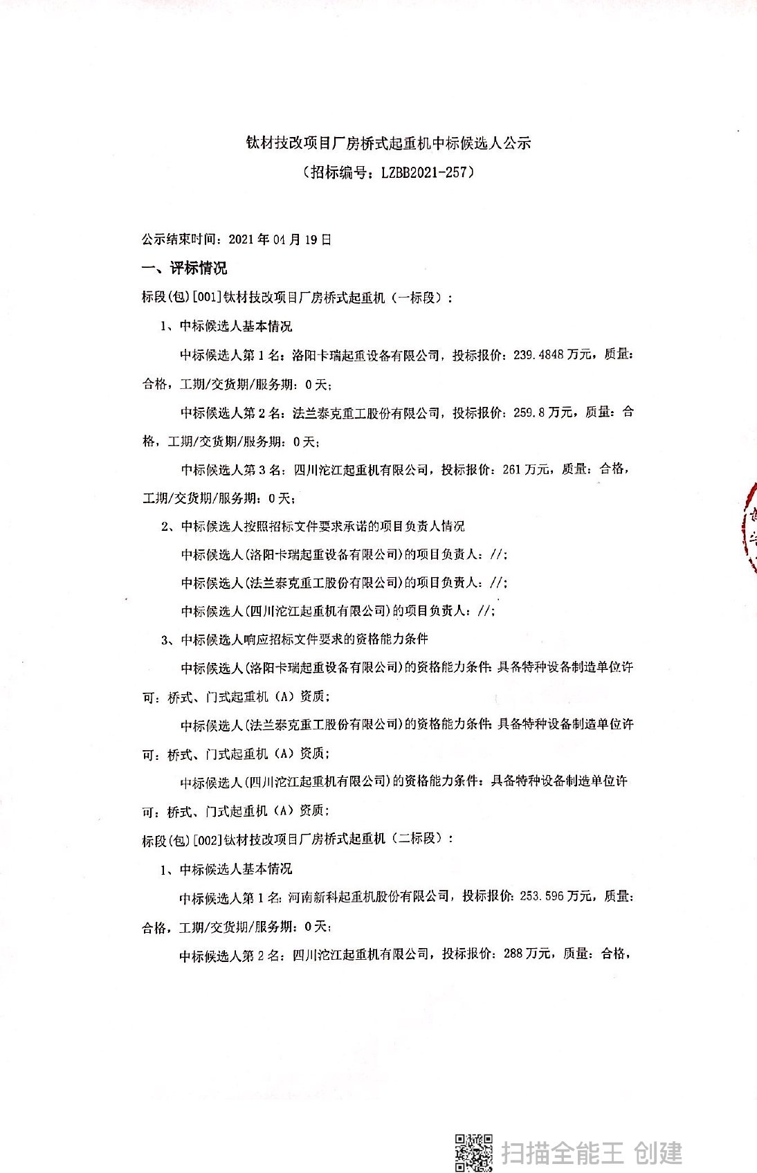 移動(dòng)版:陜西:鈦材技改項(xiàng)目廠房橋式起重機(jī)中標(biāo)候選人公示