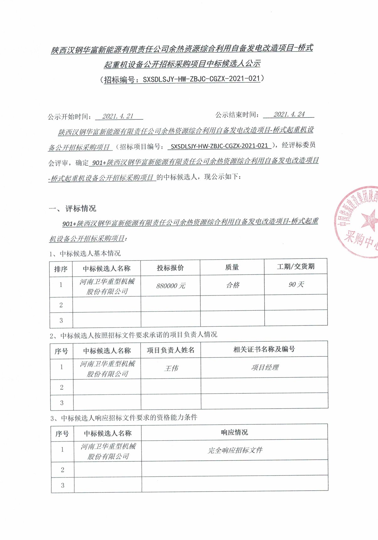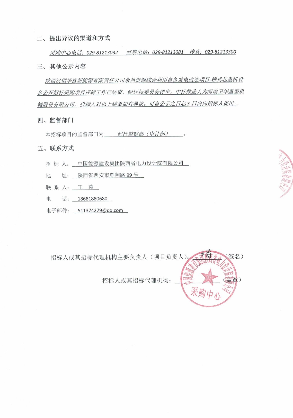 陜西漢鋼華富新能源有限責(zé)任公司余熱資源綜合利用自備發(fā)電改造項(xiàng)目-橋式起重機(jī)設(shè)備公開招標(biāo)采購項(xiàng)目中標(biāo)候選人公示