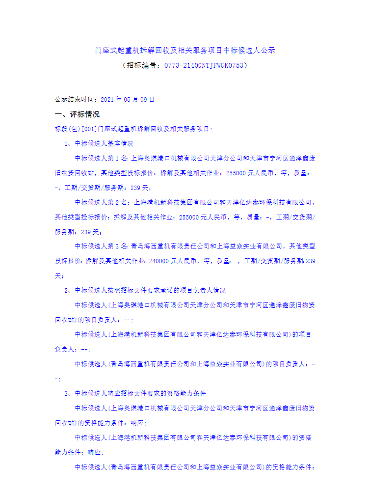 移動版:天津:門座式起重機拆解回收及相關(guān)服務(wù)項目中標(biāo)候選人公示