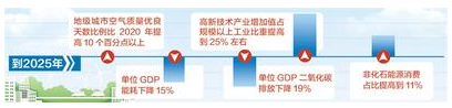 實(shí)施意見明確了主要目標(biāo):到2025年,產(chǎn)業(yè)結(jié)構(gòu)、能源結(jié)構(gòu)、運(yùn)輸結(jié)構(gòu)明顯優(yōu)化,綠色產(chǎn)業(yè)比重顯著提升,基礎(chǔ)設(shè)施綠色化水平不斷提高,生產(chǎn)生活方式綠色轉(zhuǎn)型成效顯著,能源資源配置更加合理、利用效率大幅提高;生態(tài)環(huán)境持續(xù)改善,主要污染物排放總量持續(xù)減少;市場(chǎng)導(dǎo)向的綠色技術(shù)創(chuàng)新體系更加完善,法規(guī)政策體系更加有效,綠色低碳循環(huán)發(fā)展的生產(chǎn)體系、流通體系、消費(fèi)體系初步形成;地級(jí)城市空氣質(zhì)量?jī)?yōu)良天數(shù)比例比2020年提高10個(gè)百分點(diǎn)以上,單位GDP能耗下降15%,單位GDP二氧化碳排放下降19%,高新技術(shù)產(chǎn)業(yè)增加值占規(guī)模以上工業(yè)比重提高到25%左右,非化石能源消費(fèi)占比提高到11%。